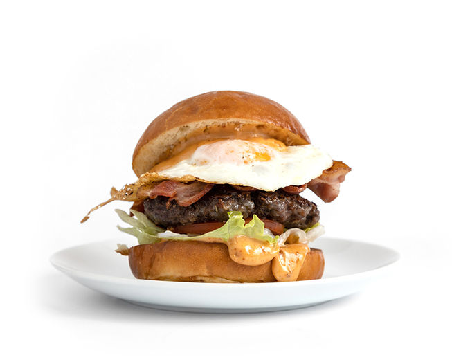 (vyzrálé hovězí 150g, naše máslová bulka, čedar, slanina, naše majonéza, kečup, kyselá okurka, červená cibule, salát)